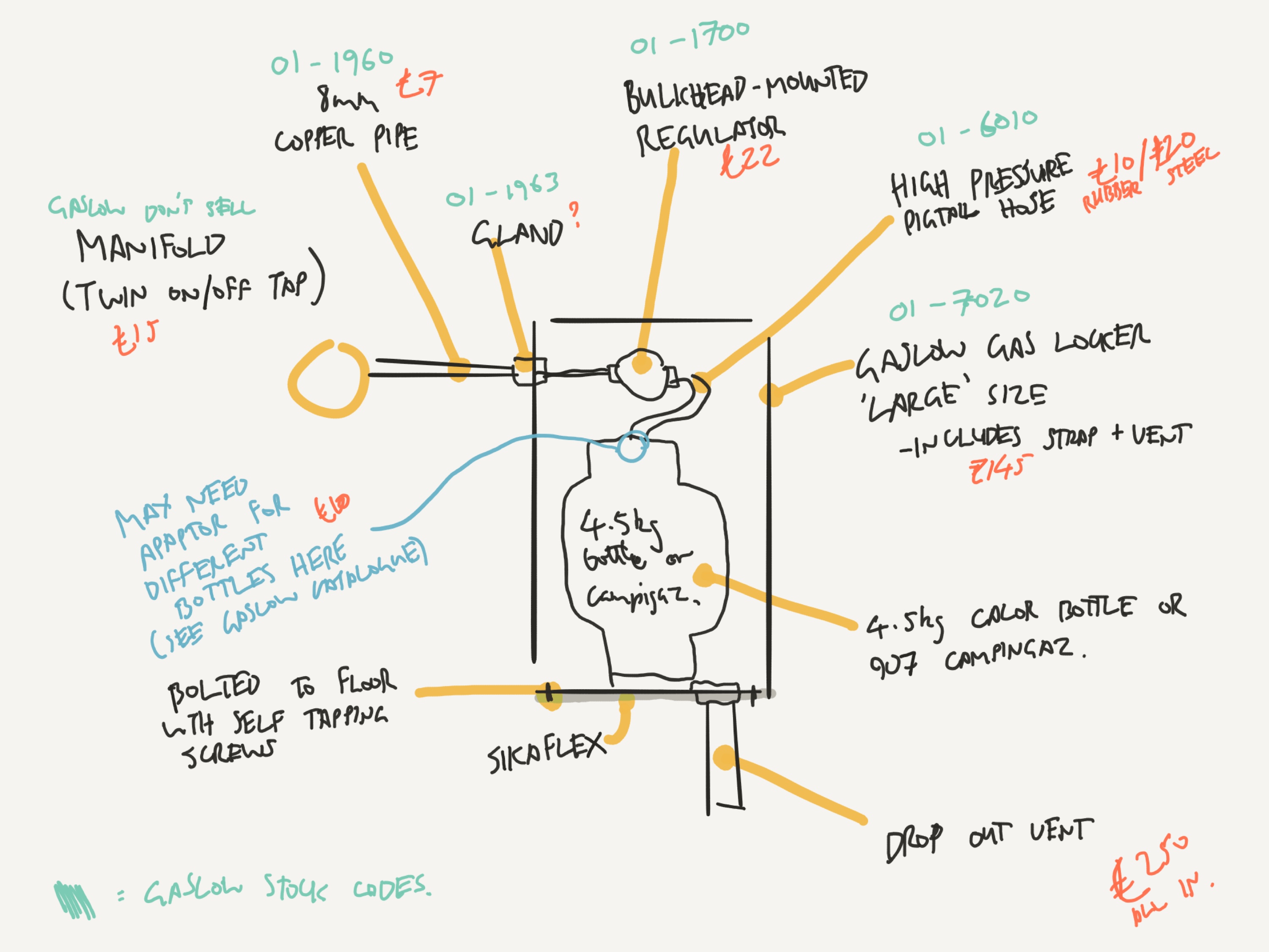 I phoned up Gaslow to ask for advice on building out a gas locker. They advised that a refillable bottle would likely be overkill for our needs, so here, I’m planning a locker and fittings for a returnable bottle such as Calorgas or Campingaz.