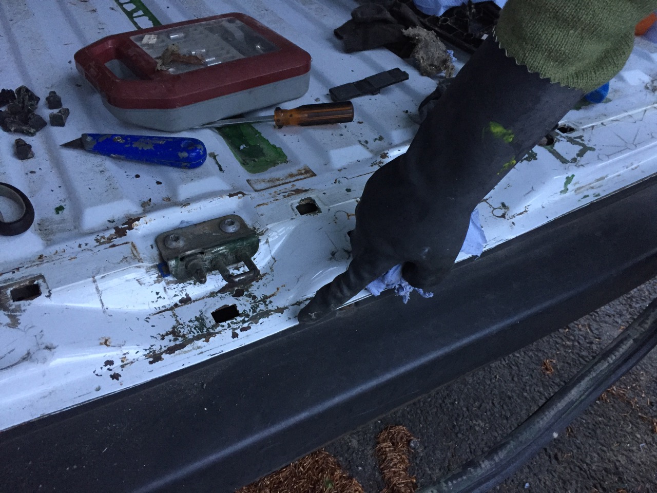 Meanwhile, Amy has been cleaning off more of the green goo, and revealing rust patches around the back door.