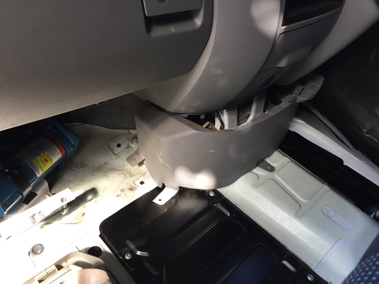 Unscrew the four screws holding the lower console casing in place. You’ll need to lift up the heavy floor mats to reach this. Slide the casing horizontally towards the seats.