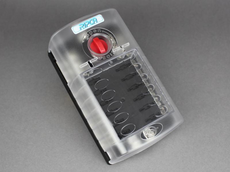 We run all the power from the battery to this fusebox, which then gives us up to 12 circuits for all the van systems.