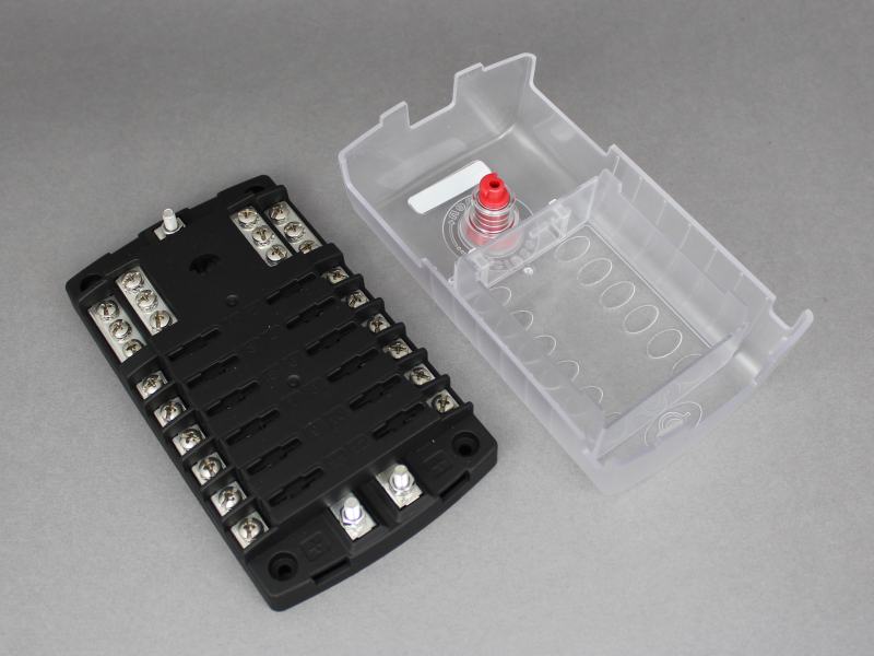 We run all the power from the battery to this fusebox, which then gives us up to 12 circuits for all the van systems.