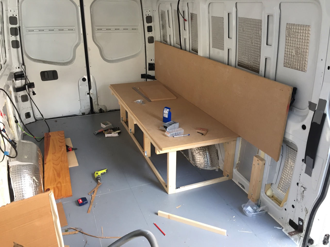 I started by building a simple bed frame. It’s mostly self supporting, with the legs nearest the wall bolted to the van body using rivnuts.