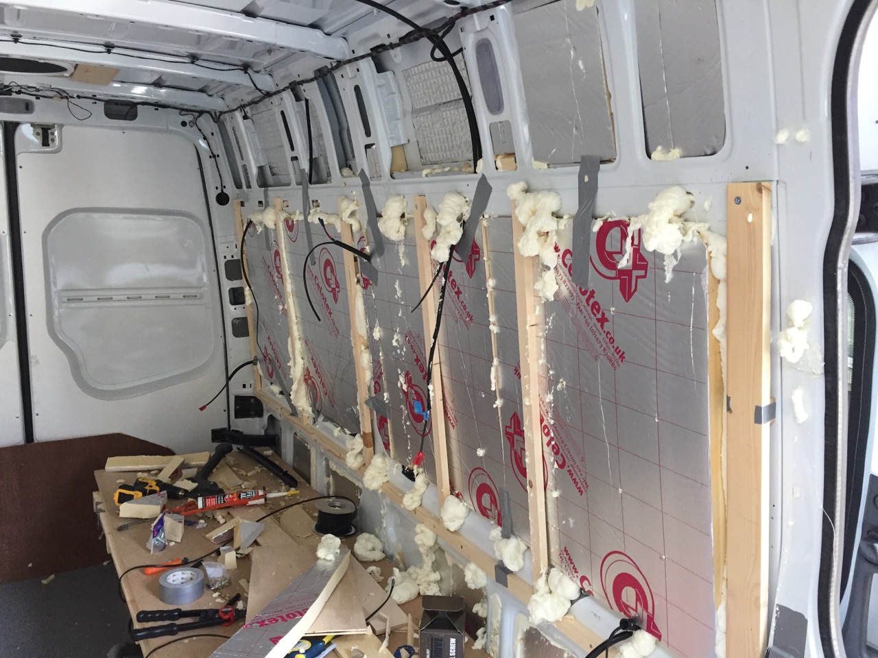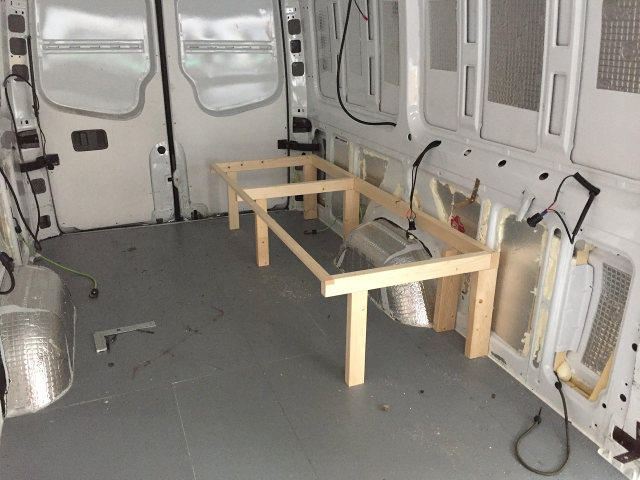 I started by building a simple bed frame. It’s mostly self supporting, with the legs nearest the wall bolted to the van body using rivnuts.
