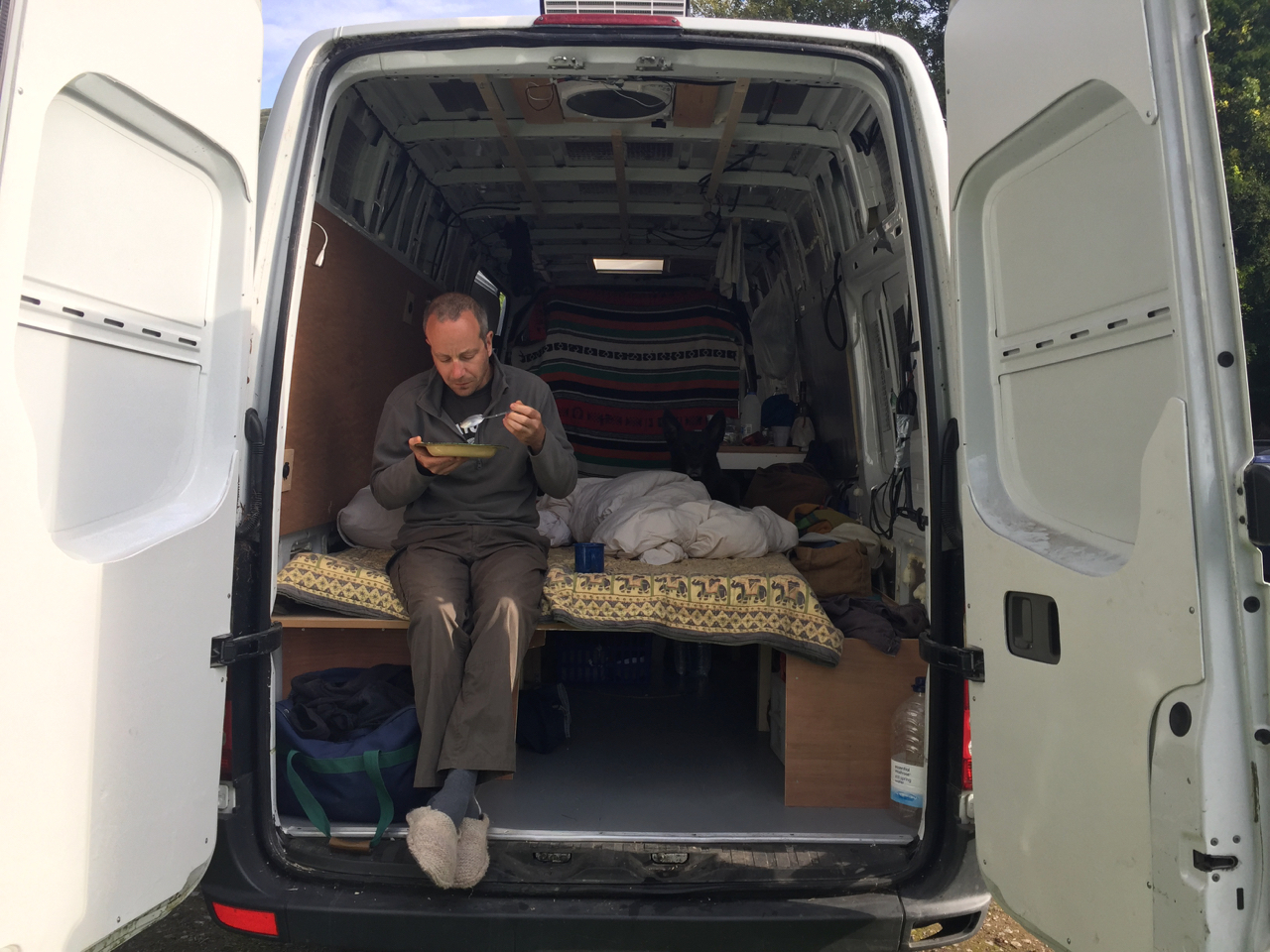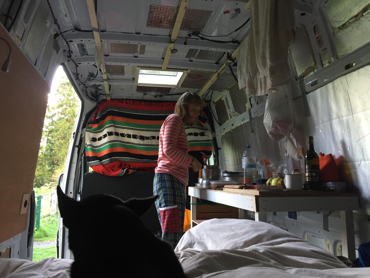 It makes sense to keep the inside of the van clean, especially when you’re hopping in and out of bed, but it’s tricky to enforce a shoes off rule when you also jumping in and out of the van so frequently. Maybe easier in hot climates when going outside means putting on a pair of flip flops, but not so easy here when you’re wearing thick socks and slippers inside, and walking boots outside.