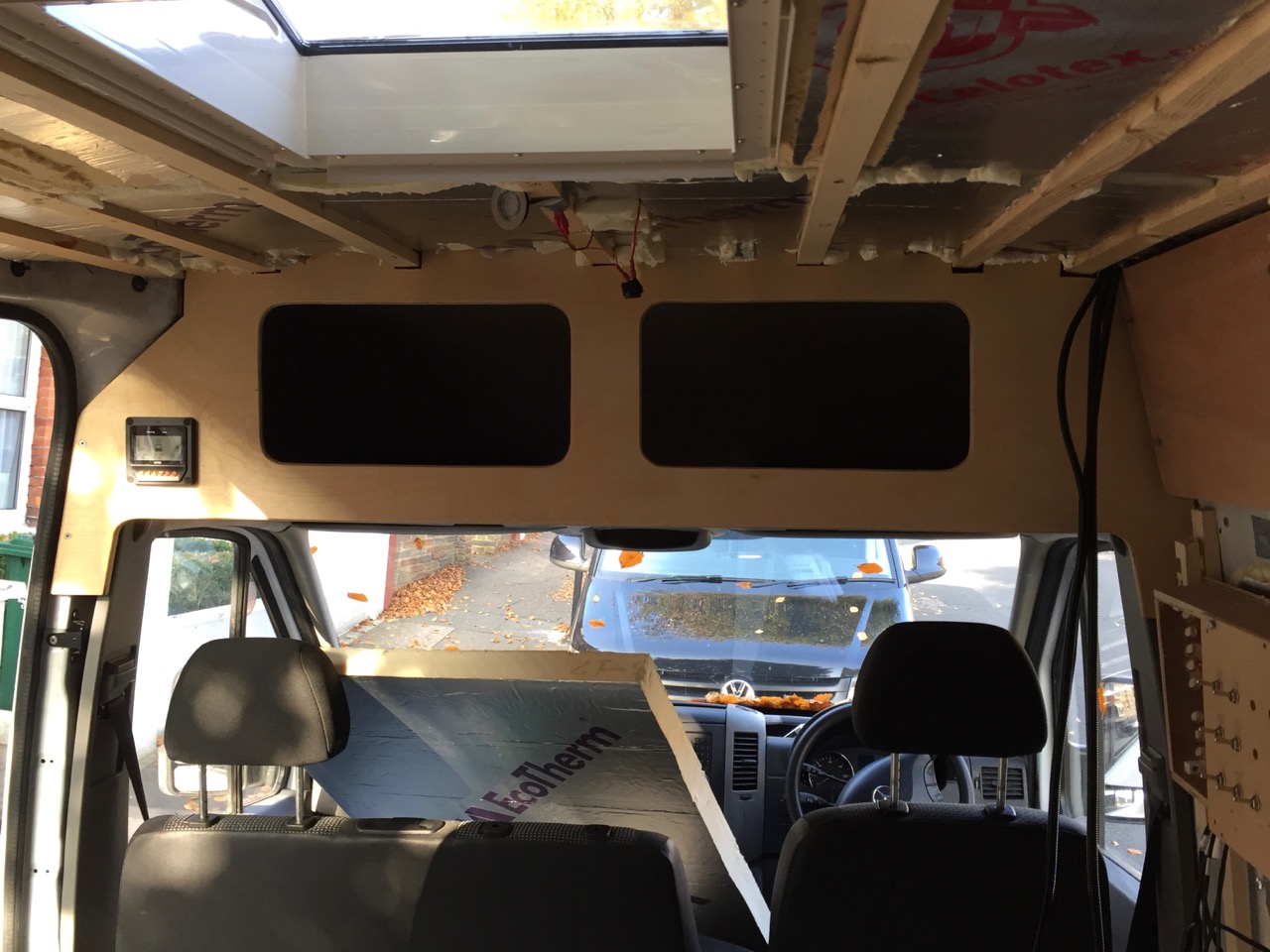 However, there’s a lot of vertical space above the seats that we wanted to make use of, so we fitted a shelf, faced with a wall at the back that forms a partial bulkhead above our heads.
