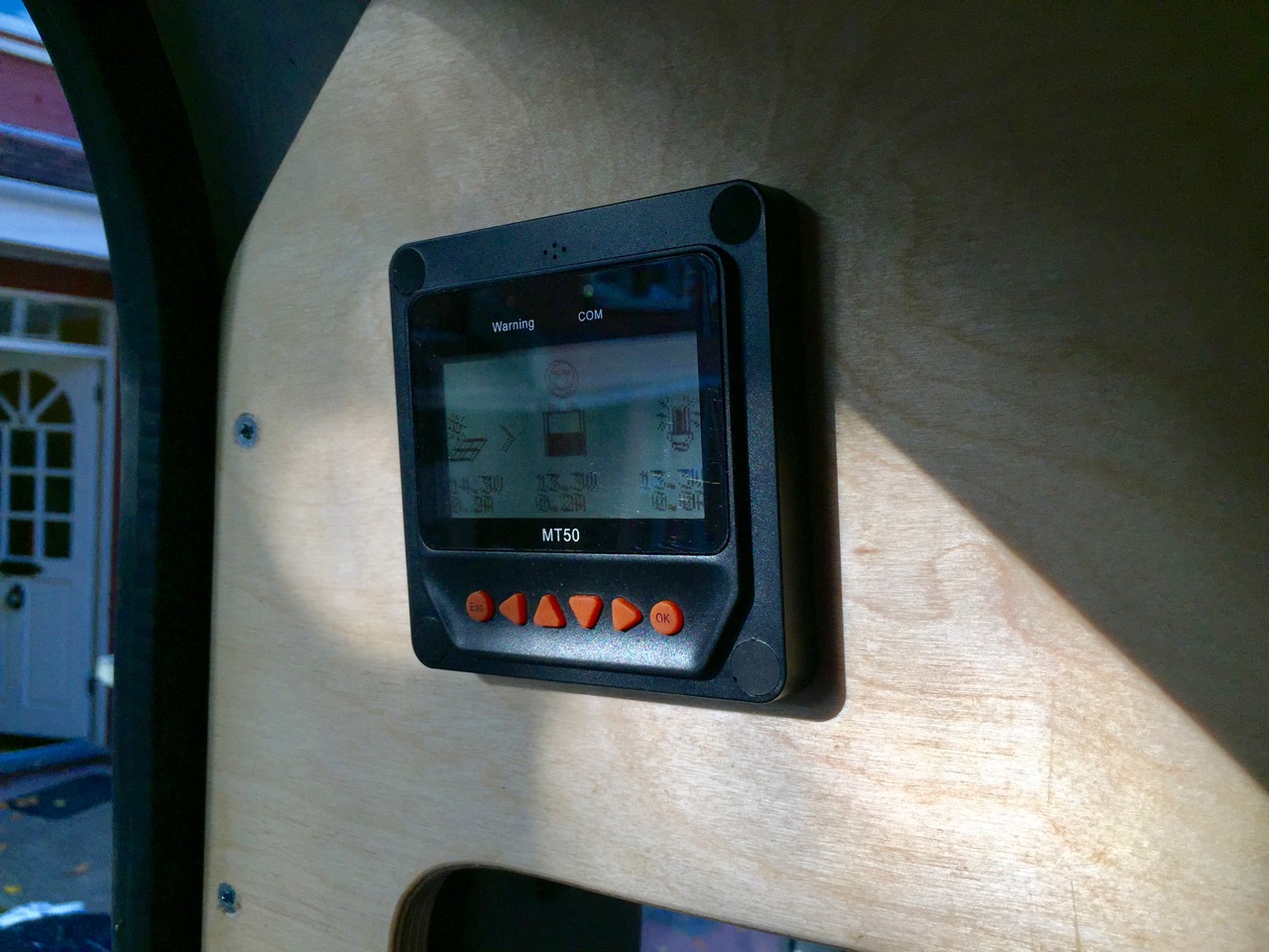 On the passenger side, we also mounted our MT-50 solar controller monitor, which gives us some live info on the state of the battery, power draw, and the performance of the panels.