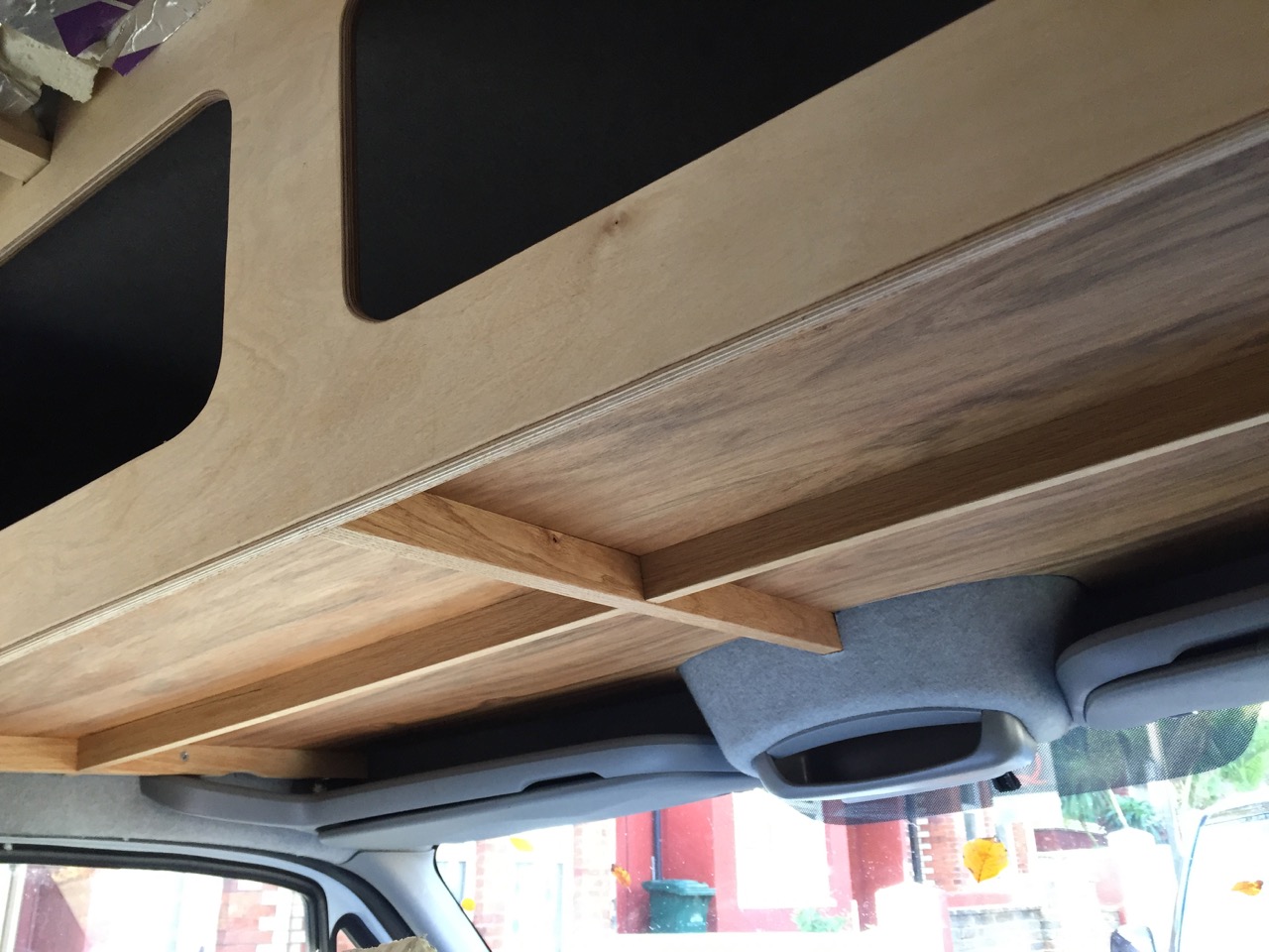 The shelf is made from 9mm hardwood ply, and it’s supported at the front and sides on oak battens, which are bolted onto existing attachment points on the cab body.