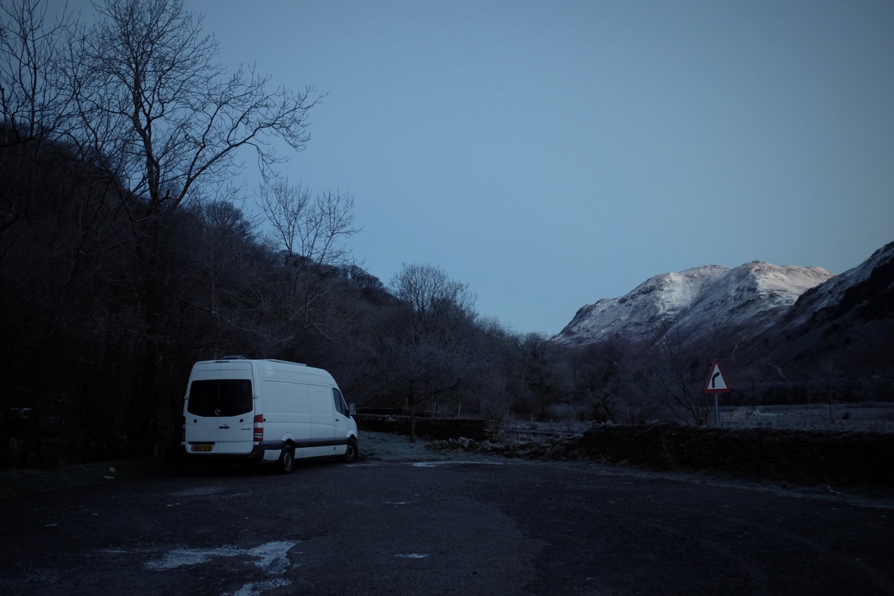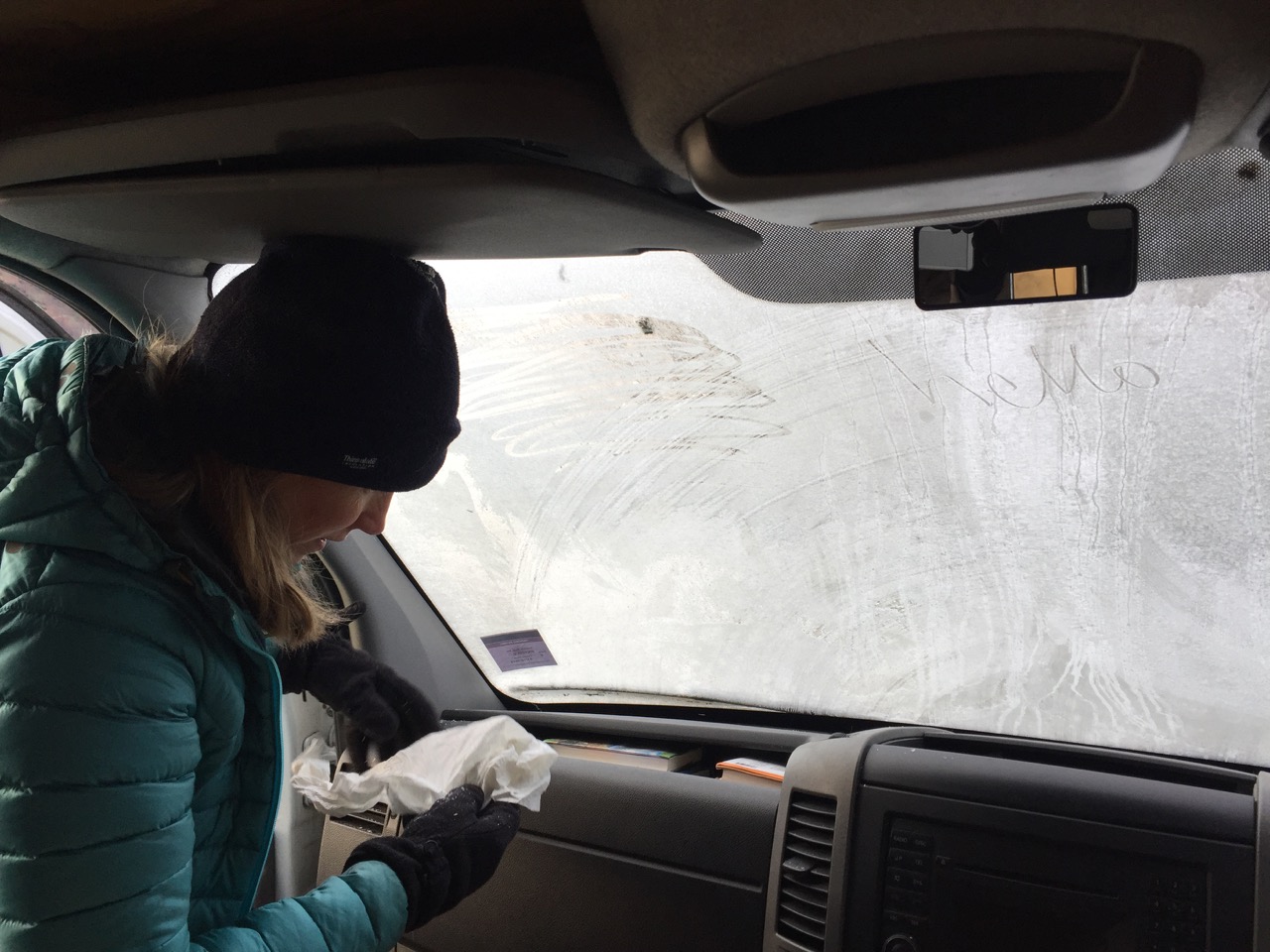 So it was v-e-r-y cold inside the van. The temperature outside dropped to around -10°C at night, and it was certainly below zero inside. We didn’t have a thermometer, but the water in the dog bowl was a solid block of ice in the morning, and there was a layer of frost on the exposed metal parts of the van, and on all the windows.