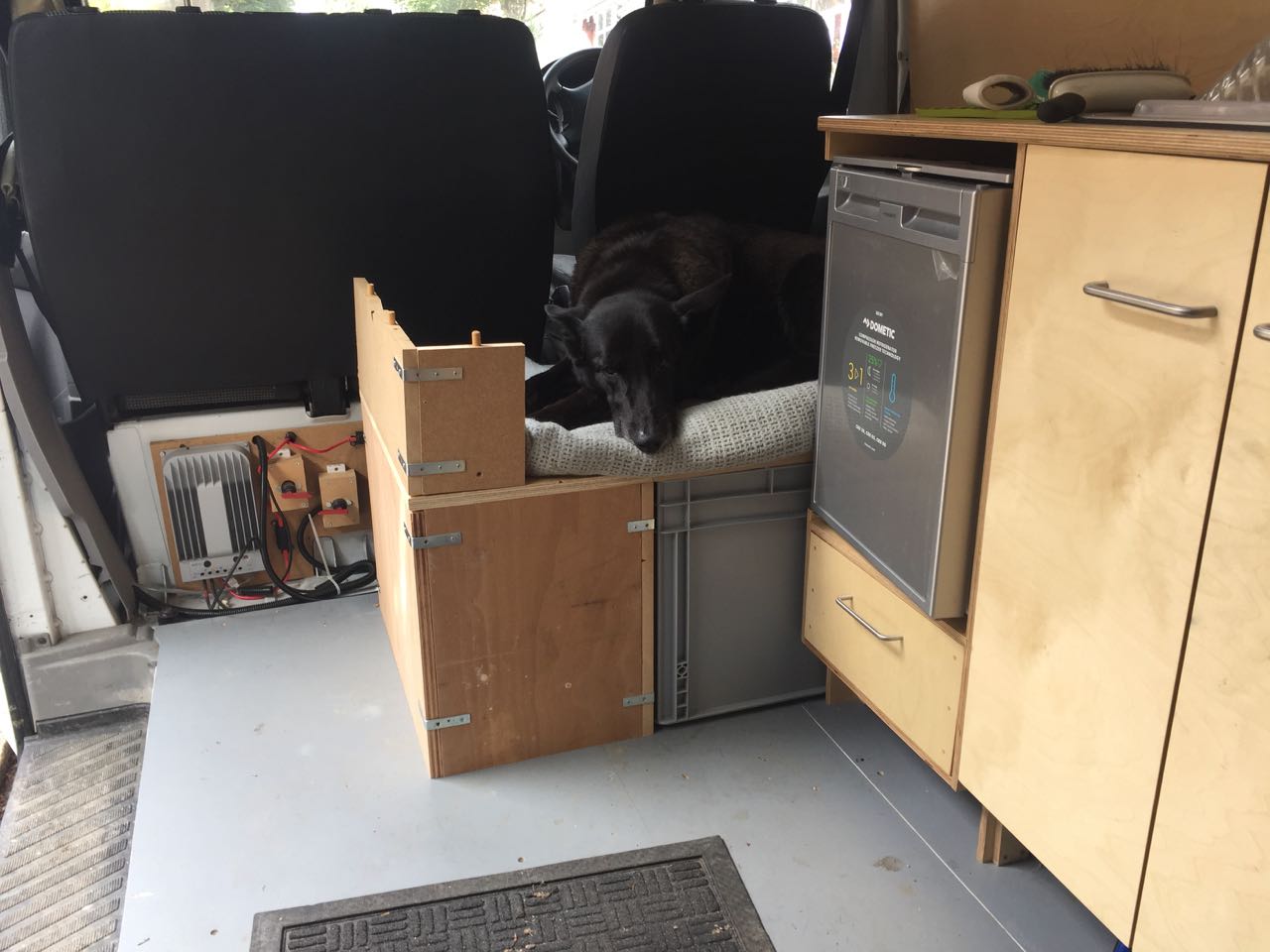 So the current prototype is a eurocrate with a lid, extended another 35cm with a ply box, also with a lid, and a wall along the passenger side, to stop Loki from falling out on that side. To the front, he’s held secure by the wooden bulkhead separating the van cab from the back. To the right is the drivers side wall. to the rear, the kitchen unit extends out about 40cm, and we’re planning to create a longer wall, which could be slid out further to stop him falling out that way.