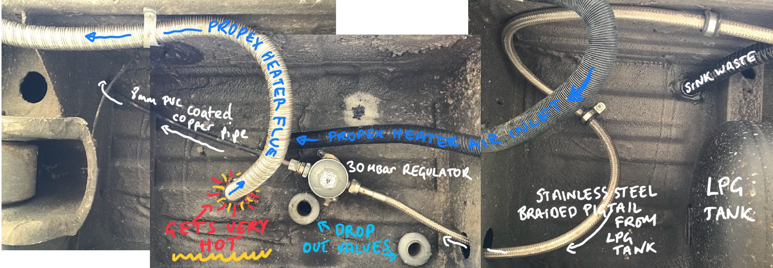 The tank outlet is connected to the regulator which is bolted to the bottom of the van floor. This is also via steel braided pigtail.