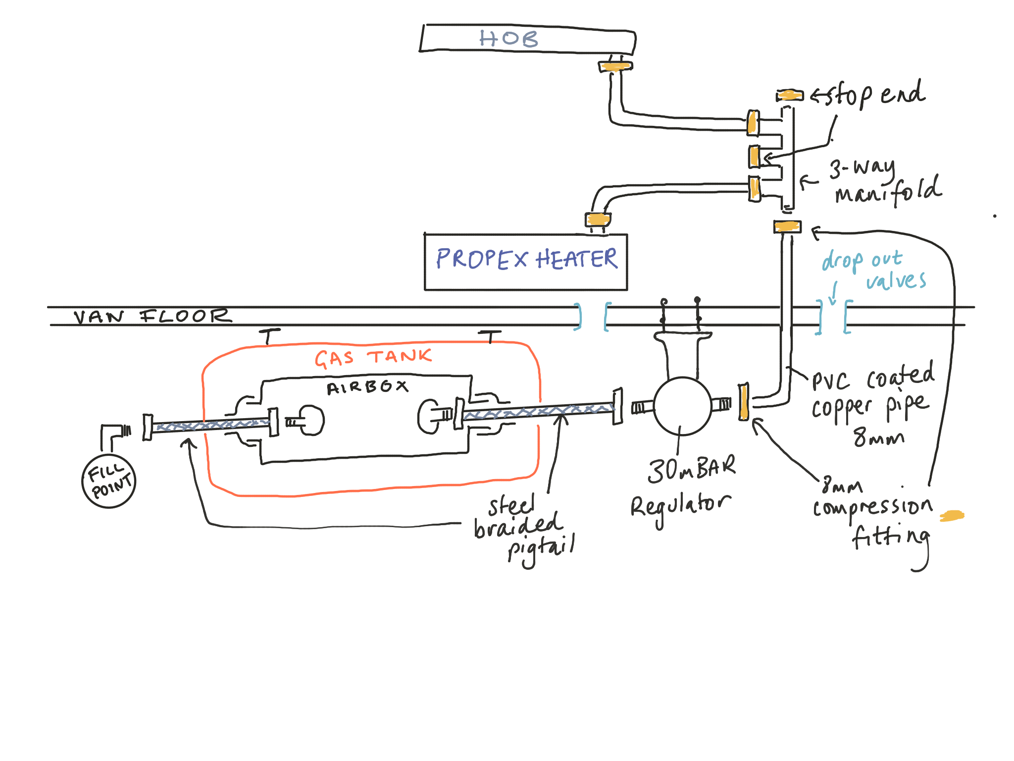 There also needs to be a drop-out valve (gas is heavier than air so it sinks down and out of the hole in the floor) in case of a leak. We put one in the cupboard where the heater and hob are, and another where the manifold is.