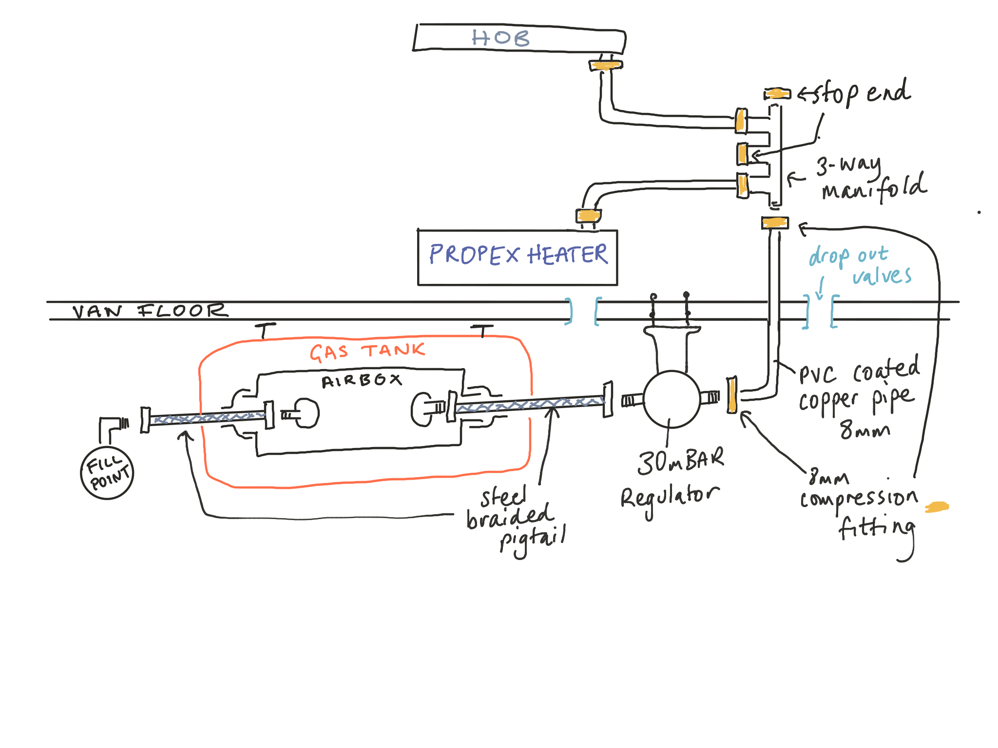 There also needs to be a drop-out valve (gas is heavier than air so it sinks down and out of the hole in the floor) in case of a leak. We put one in the cupboard where the heater and hob are, and another where the manifold is.
