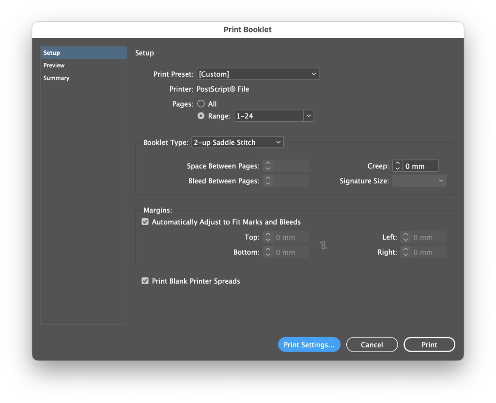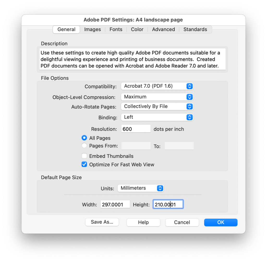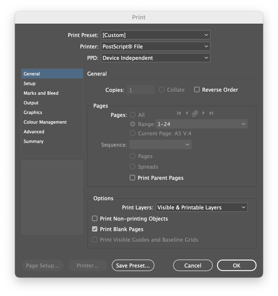 My printer is at work, but I’m doing this project at home in the evenings. So what I really want to do is print the spreads to PDF at home, and then just print that PDF quickly at work when I have a spare 5 minutes. In most Mac apps, you can select PDF as a target printer in any print dialog, but not so in InDesign. InDesign only offers Postscript as a file output from the Print Booklet dialog (there are other PDF export options elsewhere in the app). Nothing wrong with Postscript, but if you open that file in Preview or some other PDF viewing app, you’ll get a portrait crop of each spread at the wrong page size (21.59 × 27.94 cm, which is US letter size). In my case I want a page size of A4 landscape (29.7 × 21 cm).