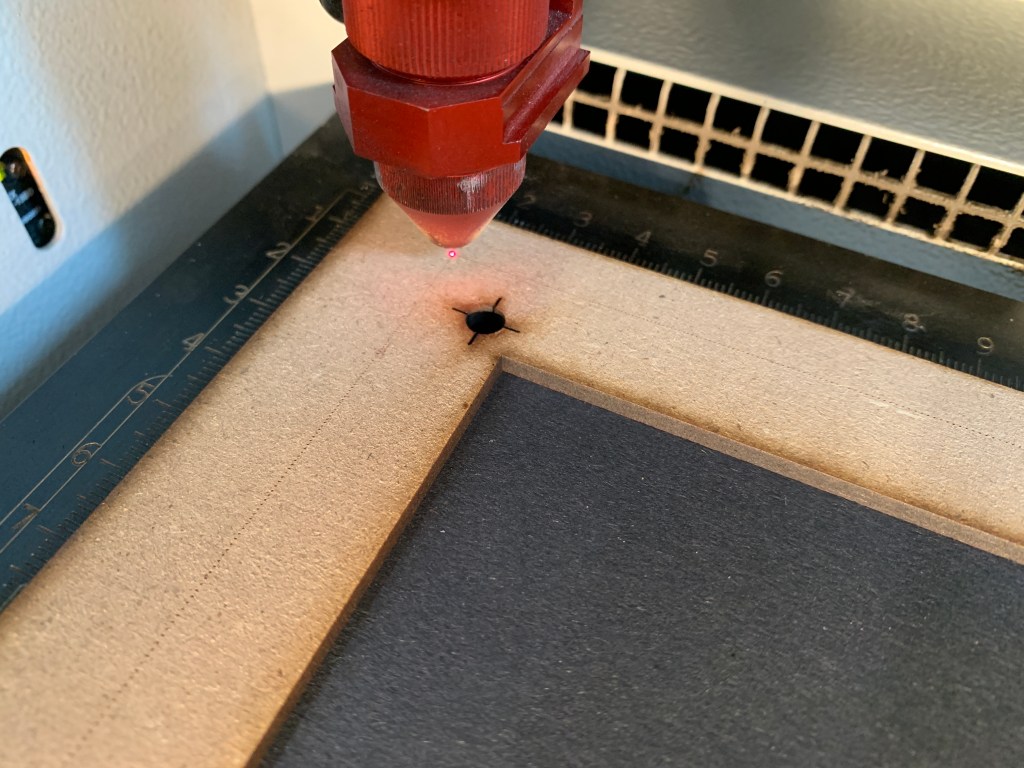 - Marked with a very light cut on the frame is a rectangle marking a size larger than A4 that I can make all my artwork at. It doesn’t really matter what this size is, as long as you can use the same size for the artwork. I made it 10 mm oversized all round (ie. 317 x 230 mm). I produce all my artwork at this size – including bleeds, so I can precisely align my origins for the artwork and the laser in the same place. In the second image, you can see the laser at its starting point in the top left corner of that marked rectangle.