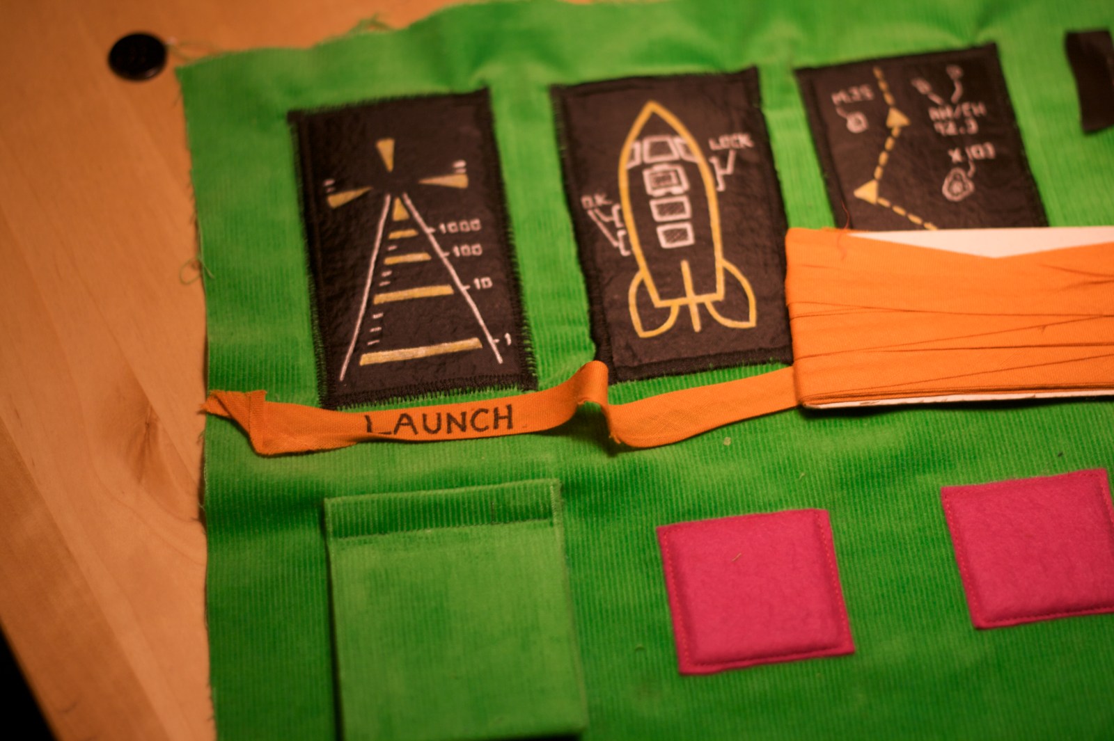 Amy and I made this rocket for our friends’ sons who share a bunk-bed. There is a long curtain with a door that covers the long open side of the lower bunk, and a cockpit control panel that goes behind the pillow inside the lower bunk.